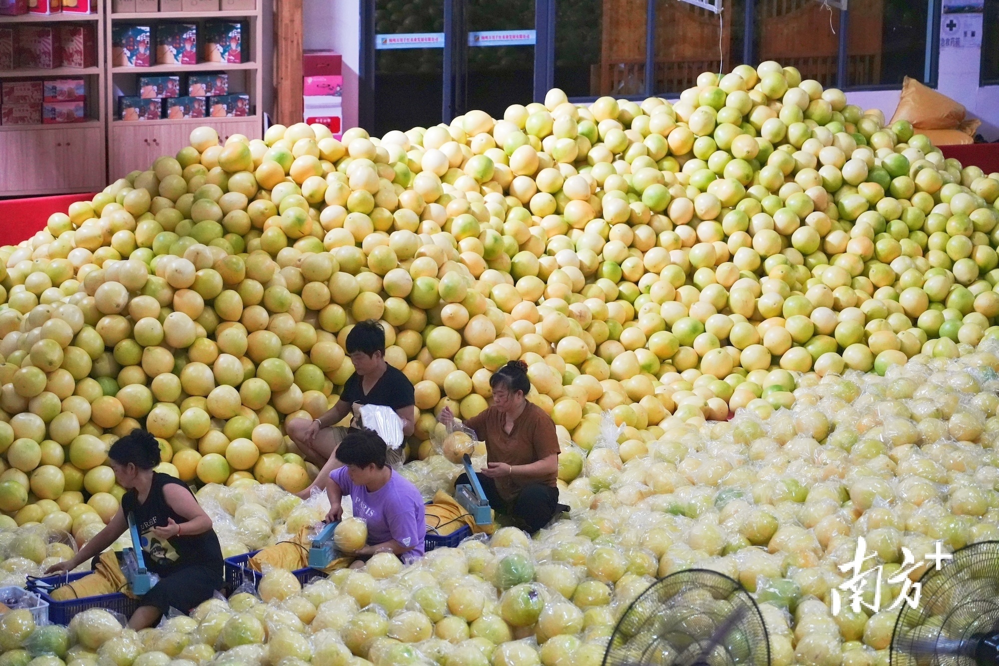 柚子仓库内,工人在包装柚果。 南方+ 何森垚 拍摄