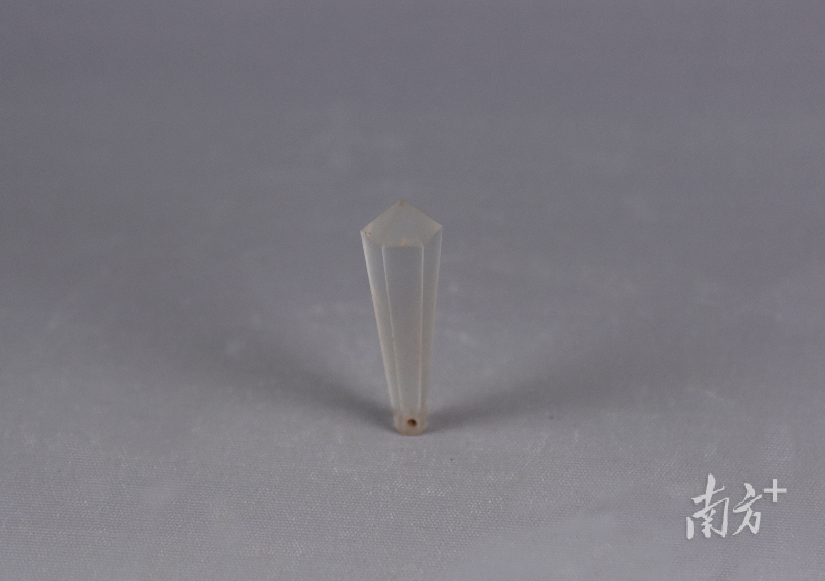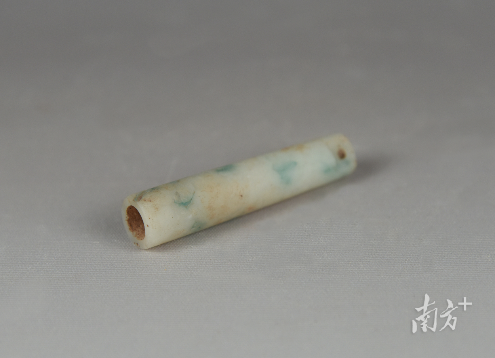 “这是我们在清代墓葬发现的文物,它是清代官员官帽上插花翎的翎管,以及朝冠顶珠上的装饰。”广州市文物考古研究院调查勘探部主任、麻鹰岗墓地发掘项目负责人程浩向记者展示了清代翡翠翎管和朝冠顶珠水晶饰件,只见翎管约一节手指长度,表面还泛着翡翠的光泽感,而朝冠顶珠水晶饰件形制精巧,水晶质感在阳光下还会透光。