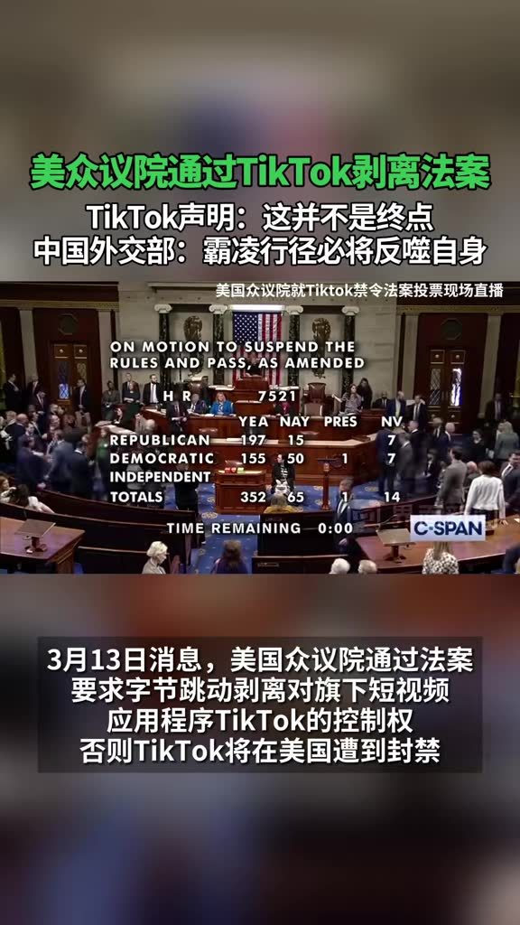 当地时间3月13日上午,美国众议院投票通过一项名叫“保护美国人免受外国对手控制应用程序侵害法”的无理法案(H.R.7521)。按照程序,该法案还需要得到美国参议院的通过,然后才能提交给总统拜登批准。