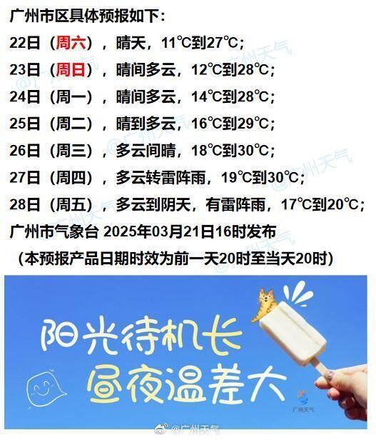 广州方面,未来几天昼夜温差仍然较大,早晚多穿一点。展望下周后期转雨,气温下降,大家保持关注啦~