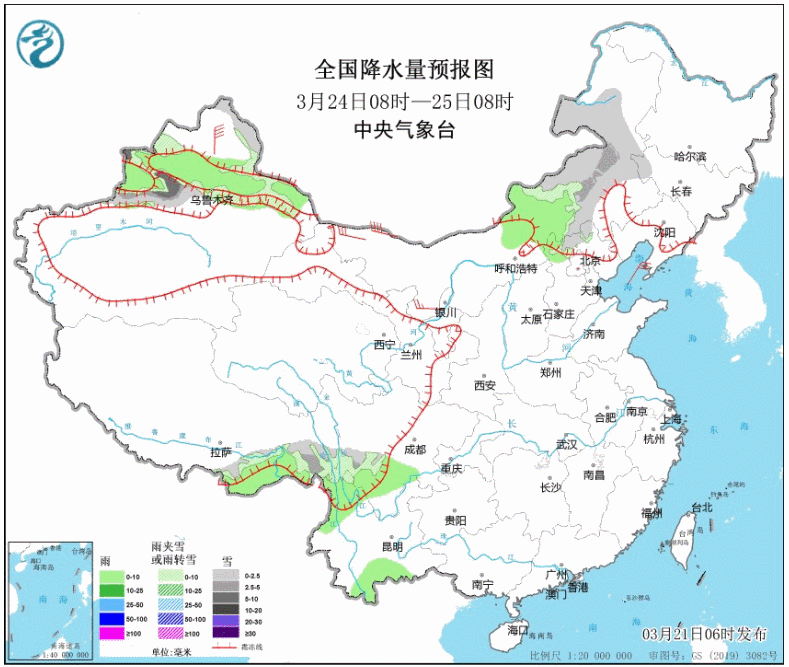 雪:新疆北部、内蒙古中东部、华北北部、东北等地有小雪或阵雪(雨夹雪),局地有中到大雪。