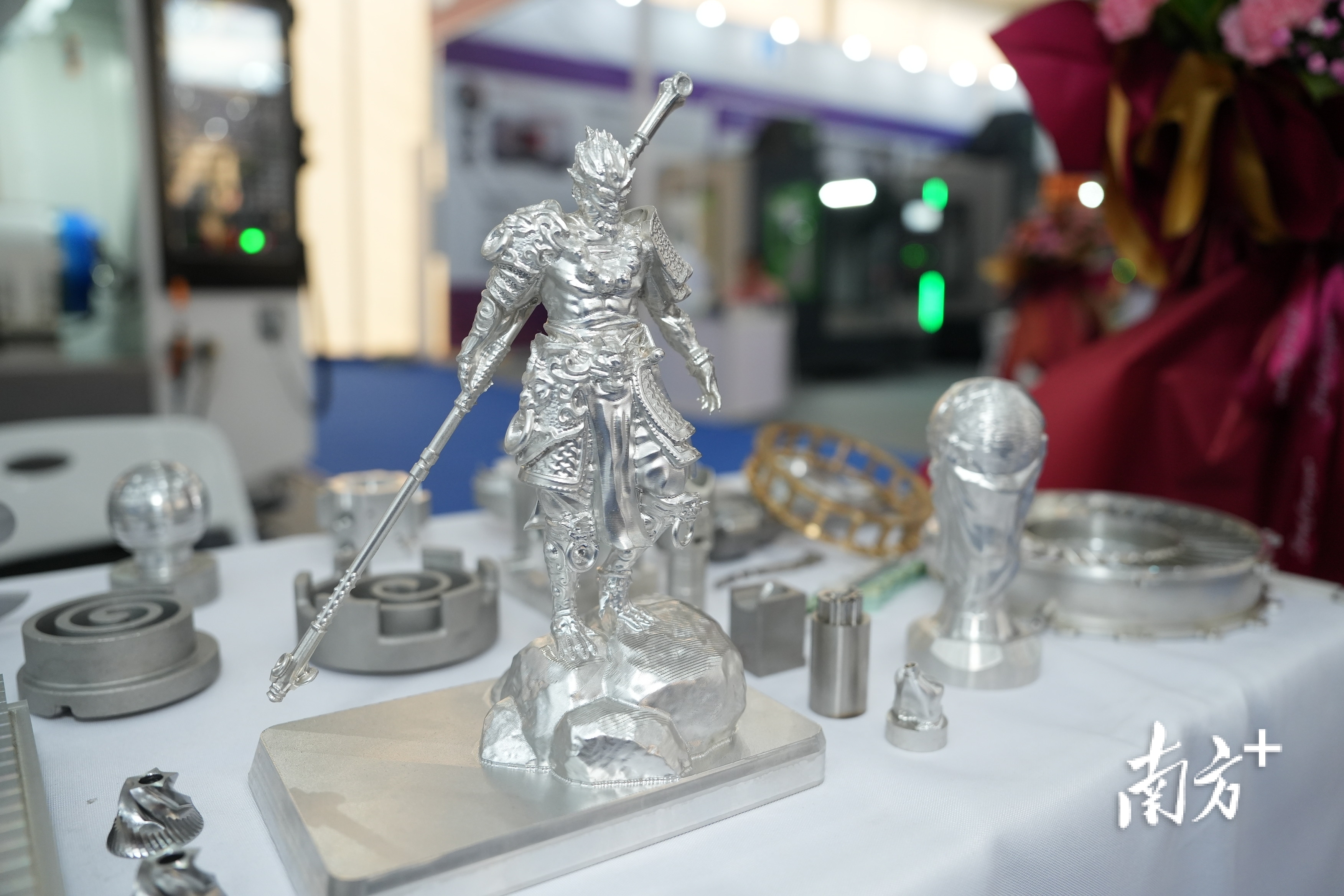 “主业”之外,高精尖机床也化身“神笔马良”花式炫技。西尔普数控设备(广东)有限公司五轴加工中心雕刻而成的全铝黑悟空,几毫米宽的金箍棒上花纹清晰可见。销售工程师尤志文说,五轴加工中心能加工直径在550毫米以内的复杂五金零件,重复定位误差仅0.003毫米,相当于头发丝的1/25。“孙悟空从建模到完成仅用25小时,且能批量加工。”