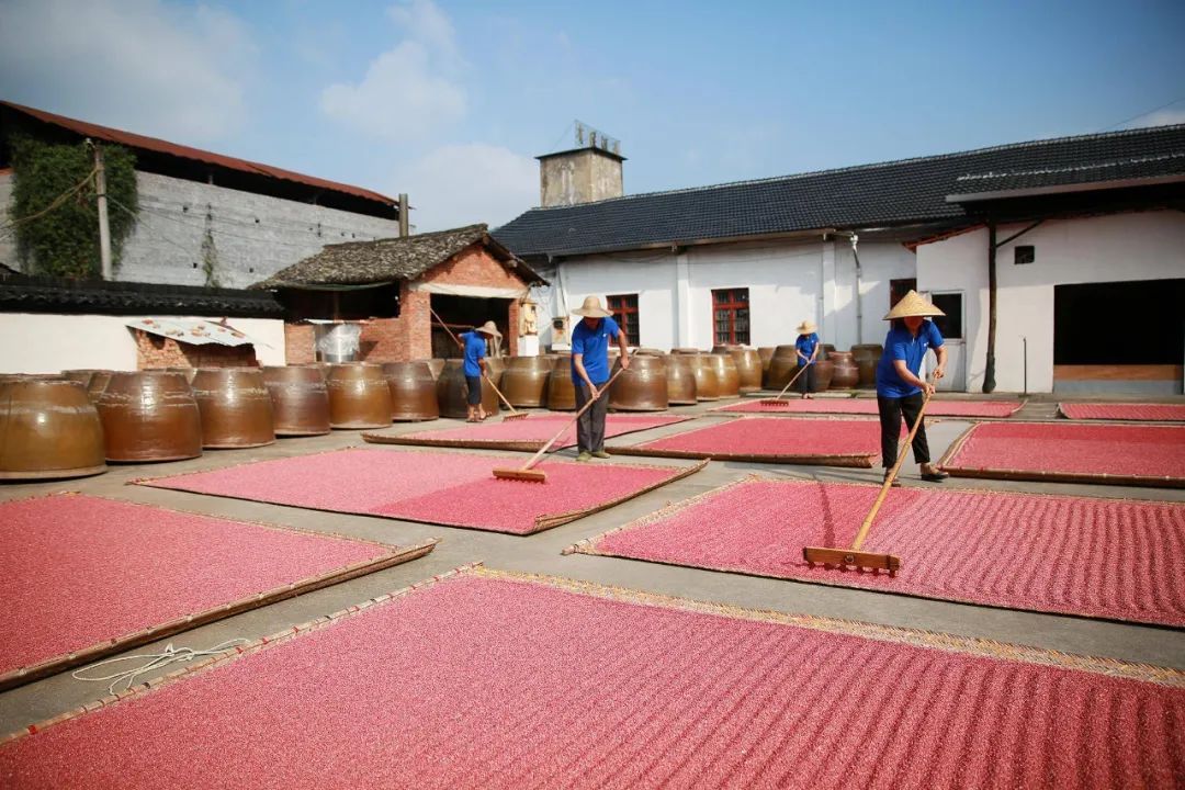 2020年8月26日,在浙江省东阳市马宅镇青联酒厂内,酿酒师傅正在翻晒红曲。图源:新华社