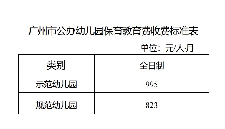 《通知》明确,公办幼儿园保育教育费收费标准实行政府定价,公办全日制规范幼儿园保教费标准为823元/月,公办全日制示范幼儿园保教费标准为995元/月。