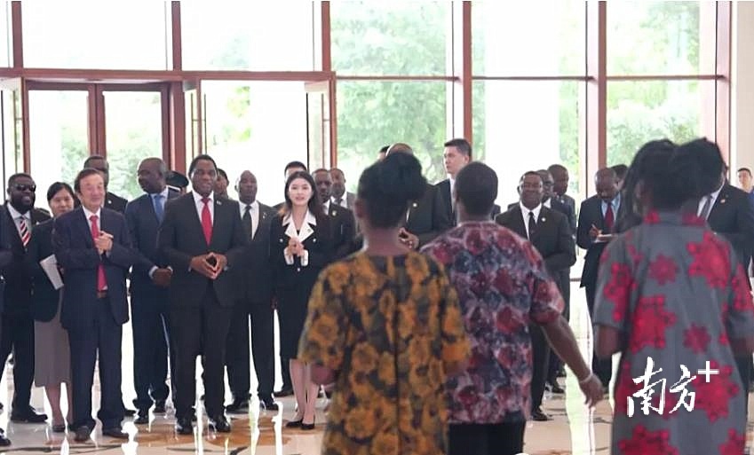当希奇莱马一行步入华为展厅时,几位非洲友人打着手鼓,唱起了《Tiyende Pamodzi》,不少观众也随声哼唱并鼓掌。这首歌由赞比亚开国总统肯尼思·卡翁达创作,是赞比亚人民日常聚会的经典曲目。随后,一位来自赞比亚的年轻员工讲解了华为的技术,并分享在华为工作的收获。