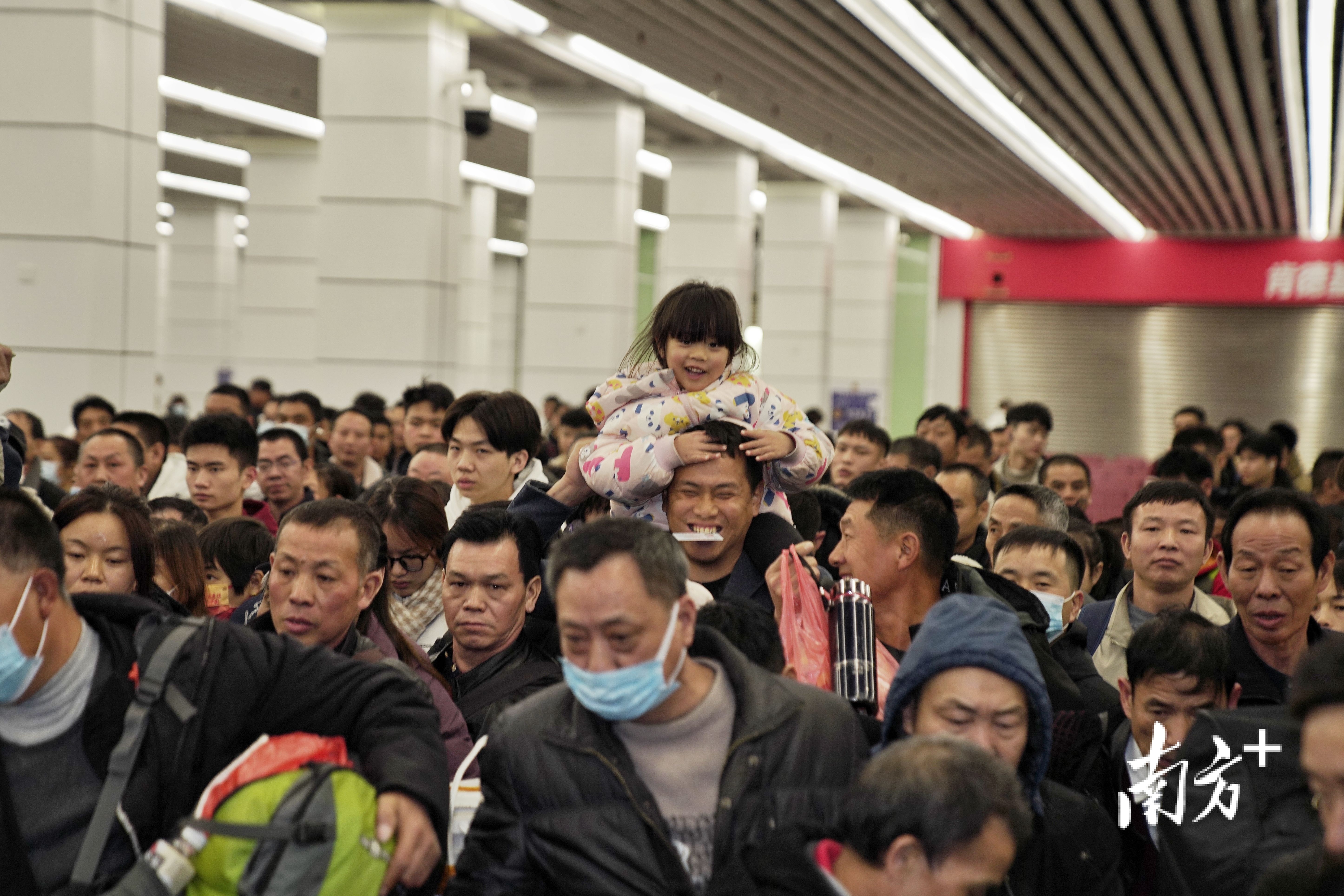候车大厅内,旅客把孩子举上肩膀蓄势待发。