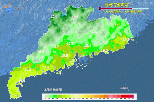 21日白天到夜间,韶关、清远、珠江三角洲北部、河源北部市县有中雨,其余市县多云到阴天,有小雨。早晨最低气温:粤北和珠江三角洲北部市县11~14℃,南部沿海市县16~19℃,其余市县14~16℃。