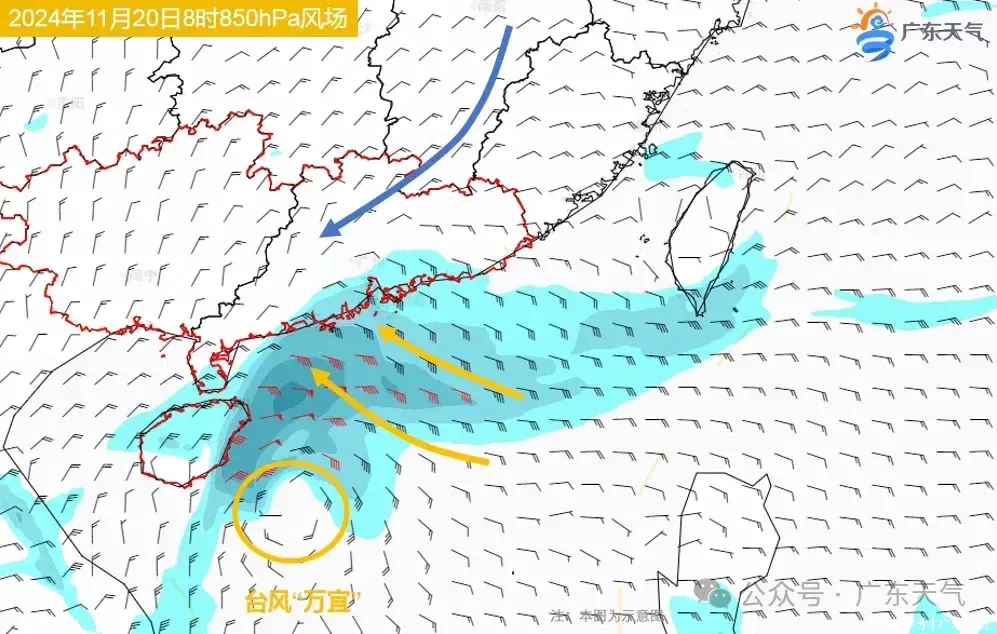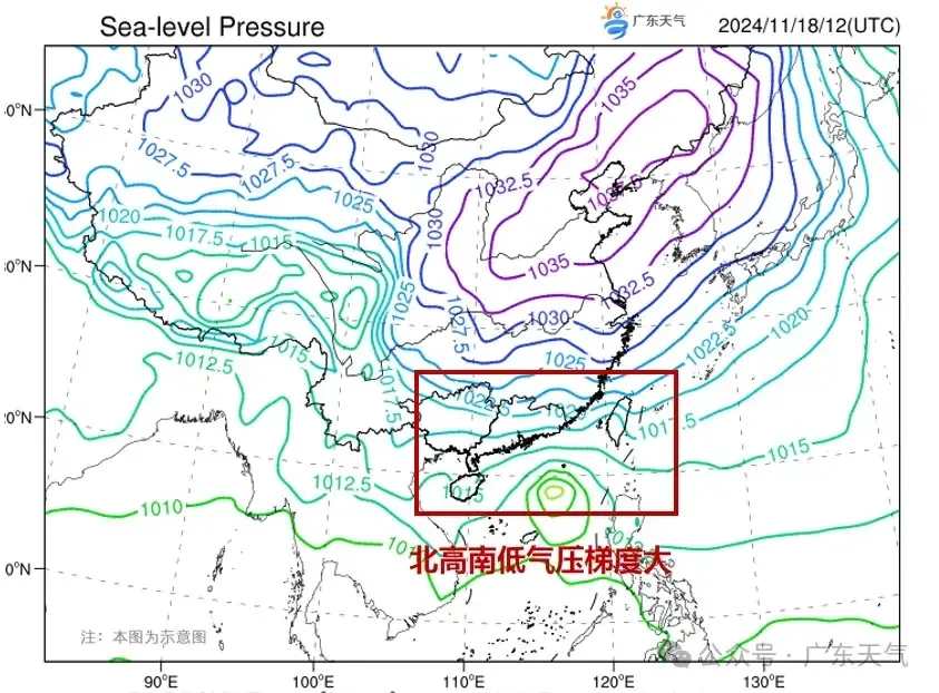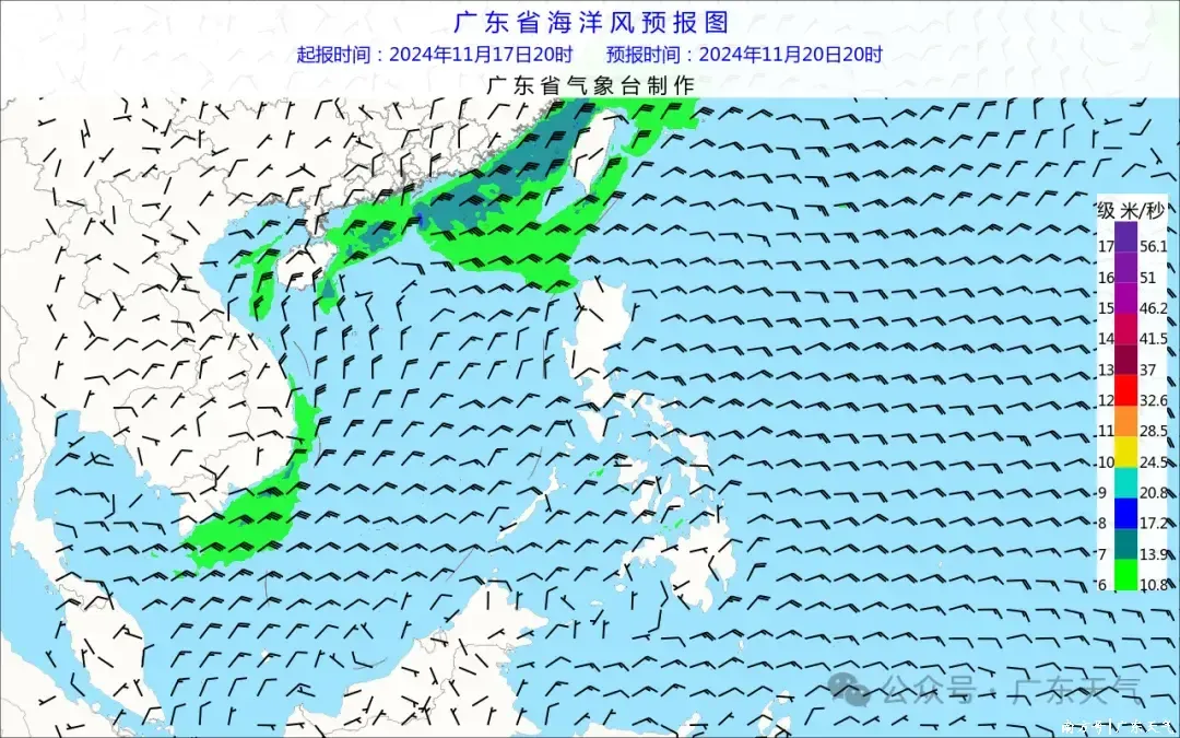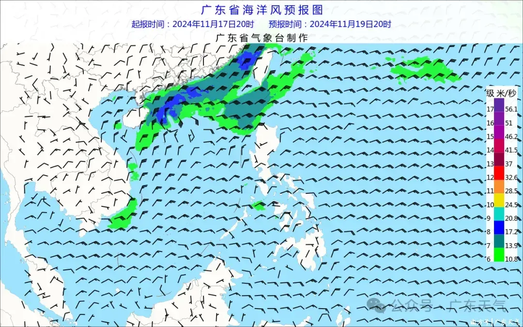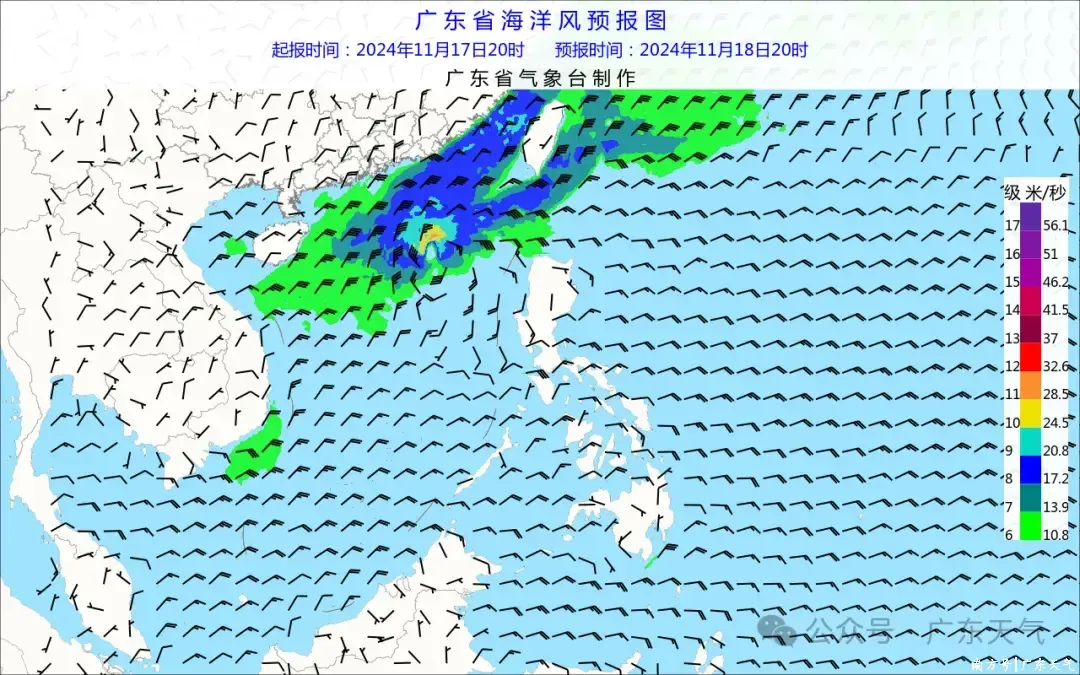 冷空气与“万宜”合作,广东处于“北高南低”的形势中,气压梯度较大,海上大风停不下来,陆地有5~7级阵风。