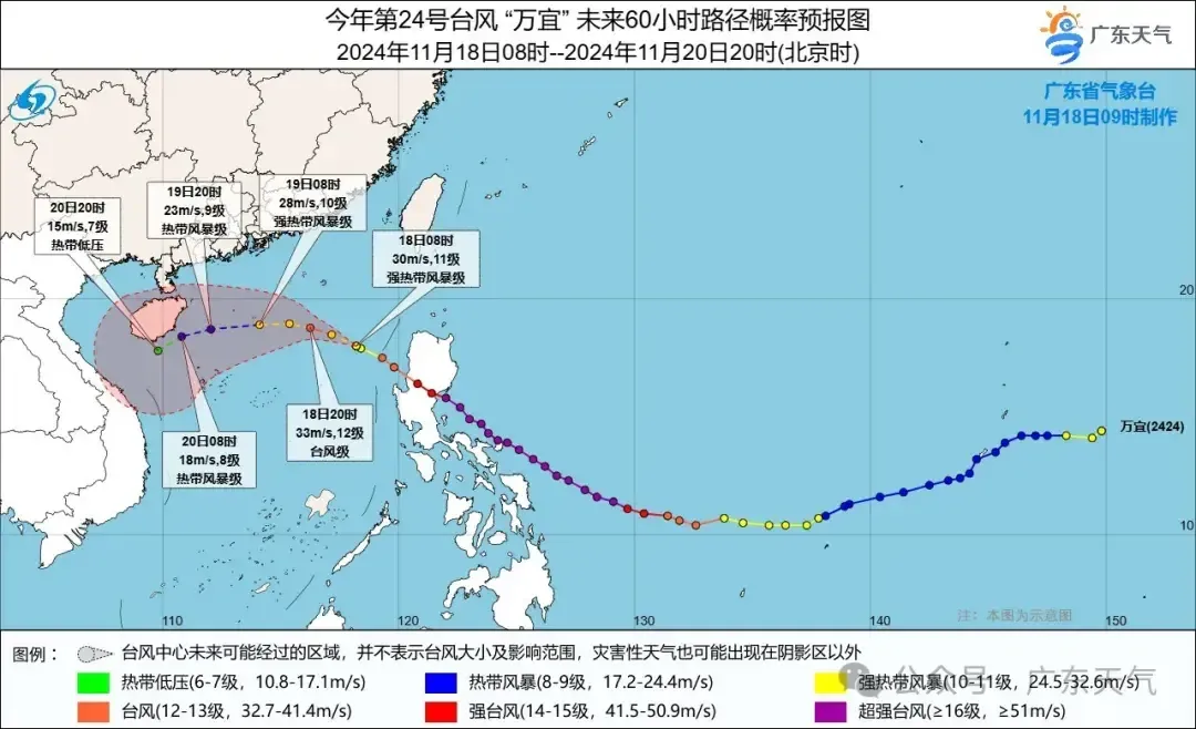 今年第24号台风“万宜”已于昨天(17日)下午3点前后在菲律宾吕宋岛东部沿海登陆(超强台风级),在吕宋岛高山削弱下,“万宜”快速减弱,17日夜间进入南海时,已经是普通台风级别,今天(18日)凌晨掉到了强热带风暴级。
