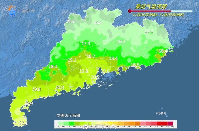 24日,粤西和珠江三角洲西部市县多云间阴天,有分散小雨,其余市县晴到多云。早晨最低气温:粤北和珠江三角洲北部市县13~16℃,粤西沿海和珠江口两侧市县19~23℃,其余市县16~19℃。