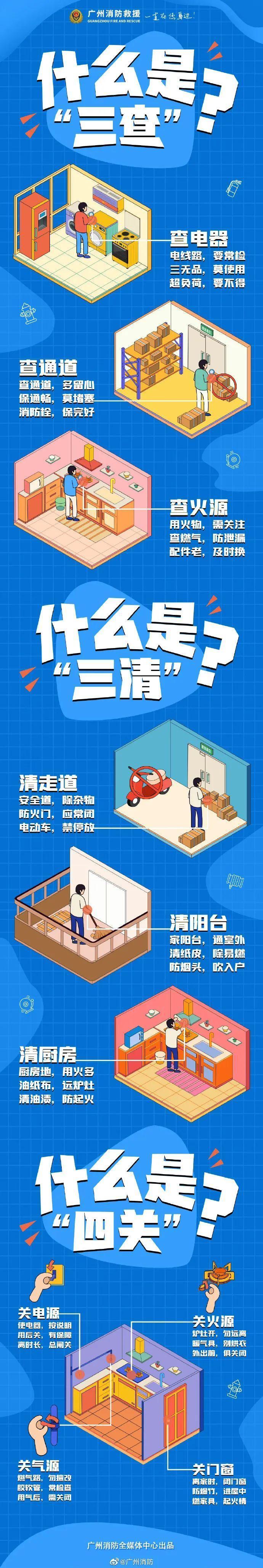 广州消防提醒,近期天气转凉,愈发干燥,记得出门及时查看天气预报,做好防寒保暖措施。家庭防火牢记“三查三清四关”,具体做法如下: