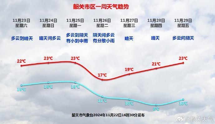 @广东天气 预计,受东南气流影响,25日广东中西部有一次中到大雨降水过程。新一股中等偏强冷空气25日傍晚影响粤北,25日夜间到26日早晨影响中南部市县,受其影响,全省气温下降4~7℃,体感寒冷。其中,下周韶关最低气温将降至个位数。