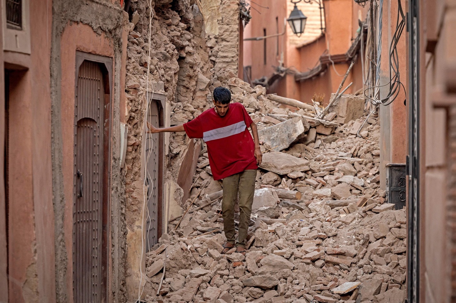 摩洛哥马拉喀什,一名居民在废墟中穿行,图源 Fadel Senna/AFP/Getty Images