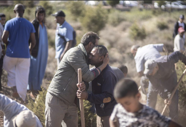 在靠近马拉喀什的村庄Ouargane,人们在埋葬遇难者时互相安慰。图源:美联社