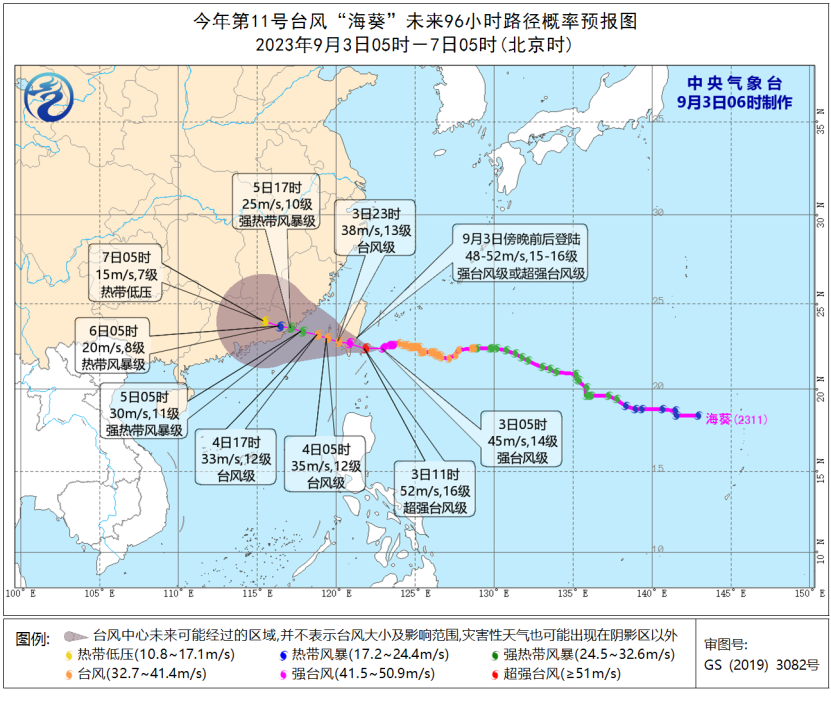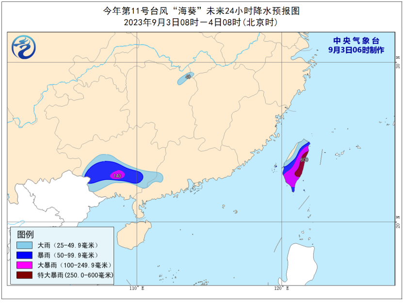 9月3日8时至4日8时,受“苏拉”和“海葵”影响,广西中南部、广东西南部、台湾岛等地部分地区有大到暴雨,其中,广西中南部、台湾岛中东部等地部分地区有大暴雨,台湾岛东部部分地区有特大暴雨(250~600毫米)。
