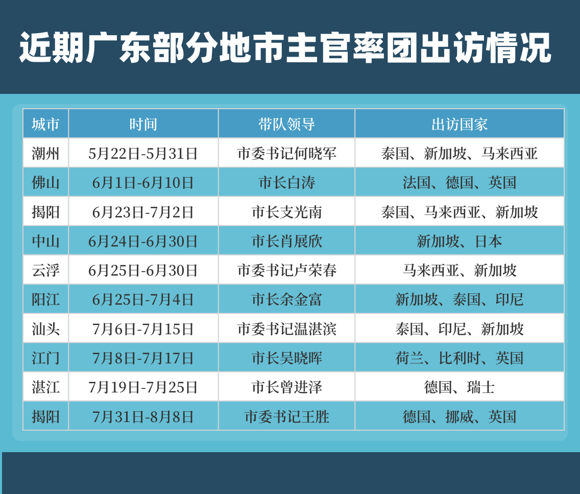 其中佛山出访法国、德国、英国;湛江出访德国、瑞士;揭阳出访德国、挪威、英国;江门出访荷兰、比利时、英国;中山的出访目的地中则有日本。