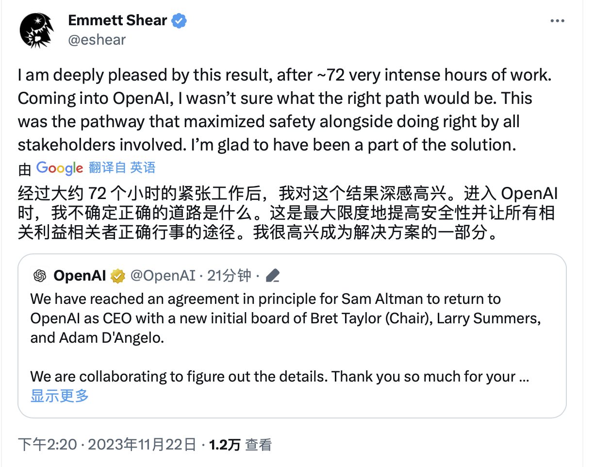 OpenAI代理CEO埃米特·谢尔(EmmettShear)称,经过了大约72小时高强度工作后,对这个结果深感高兴。