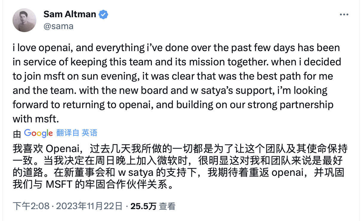 奥特曼随后发文称,自己深爱OpenAI,过去几天所做的一切都是为了让这个团队及其使命保持一致,“当我决定在周日晚上加入微软时,很明显这对我和团队来说是最好的选择。在新董事会和纳德拉的支持下,我期待着重返OpenAI,并巩固我们与微软的牢固合作伙伴关系。”