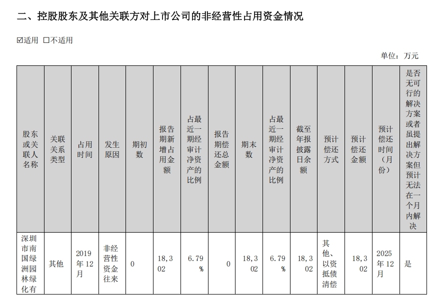 节能铁汉于2011年在深交所创业板挂牌上市,为创业板首家生态环境建设上市公司。主营业务涵盖生态修复、生态环保、生态景观和生态科技。节能铁汉2024年年报显示,深圳市南国绿洲园林绿化有限公司(以下简称“南国绿洲”)通过工程代付协议等方式,自2019年12月起占用节能铁汉非经营性资金1.83亿元,占用期限已逾五年。