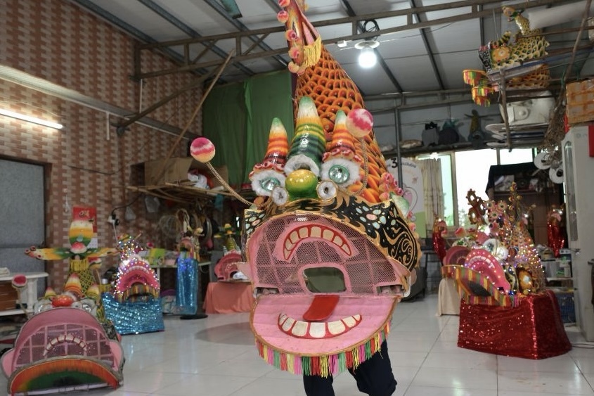 沙涌鳌鱼外形独特——尾巴上翘,扁嘴大口,鼻孔上插着一大两小三支犄角。公鳌鱼红底金鳞,尾巴呈葵扇状;母鳌鱼绿底银鳞,尾巴如芙蓉状。“一公一母相伴而舞,寓意夫妻和睦、相互尊重。”幸泽良解释道。