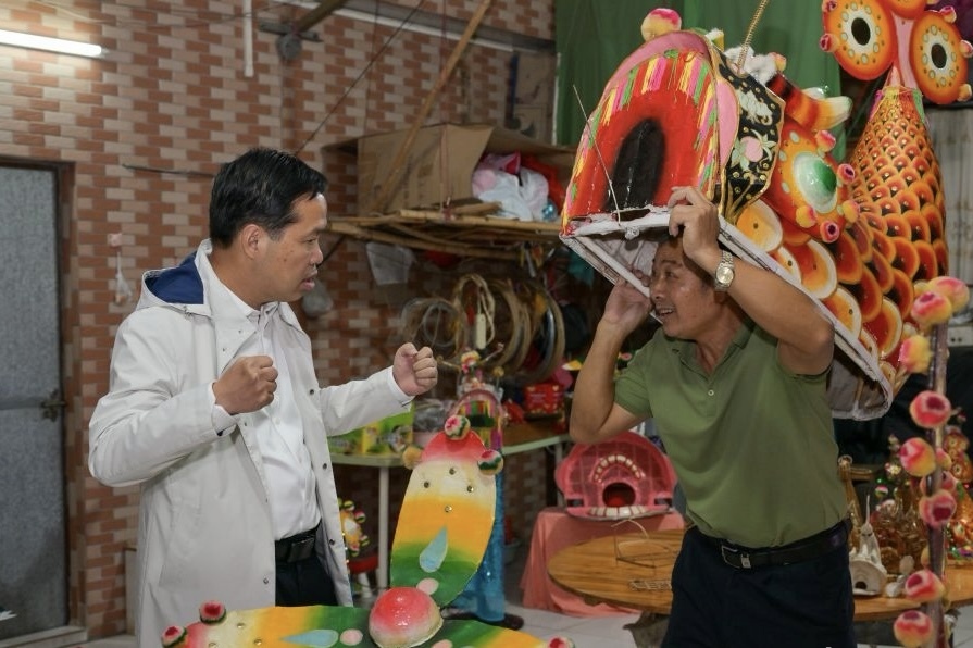 11月13日晚,番禺区委书记黄彪带领文化部门专程来到幸泽良的工作坊调研慰问。黄彪对幸泽良数十年来坚守非遗传承的精神表示赞赏,他指出,鳌鱼能在十五运会开幕式上大放异彩,离不开传承人对这一文化瑰宝的长期守护与深刻诠释。正是这份扎实的传承根基,为鳌鱼文化走向全国舞台奠定了坚实基础,也为番禺进行了一次卓有成效的文化推广。