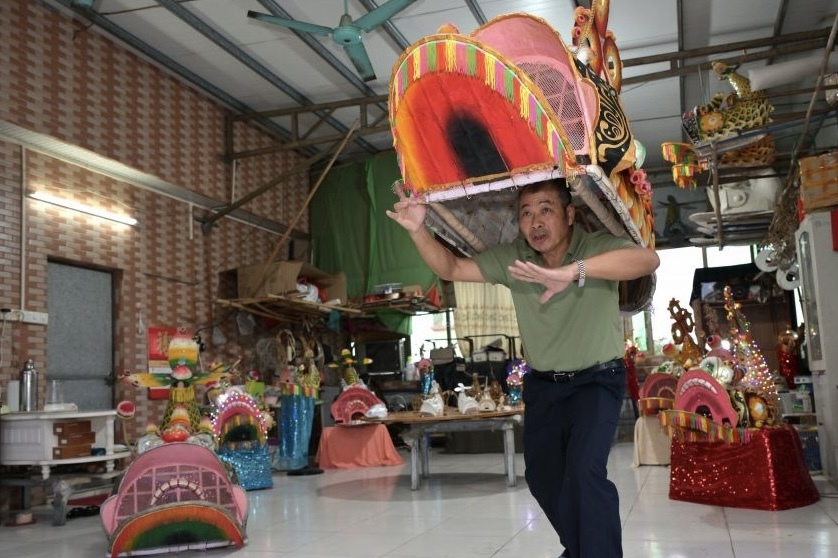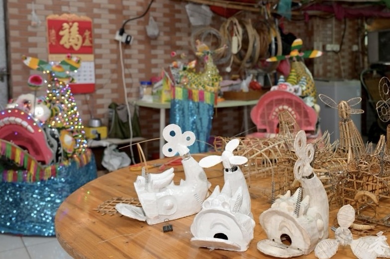 二十岁时,幸泽良又开始钻研更深邃的鳌鱼制作技艺。从根据尺寸定比例、用竹篾扎出稳固的骨架,到一层层铺布贴纸、细致上漆彩绘,一条完整的鳌鱼,至少要花十五天时间才能完成。他说,传统手艺容不得半点马虎:“做鳌鱼得用竹篾、铁线、弹簧这些老材料,光贴纸就有讲究——要粘贴六层砂纸,再覆一层蚊帐布,每一层都得等彻底干燥了,才能进行下一步,不然道具容易开裂、变形。”正是这份精益求精的匠心,让沙涌鳌鱼经得起时间的考验、承受得起成年人的重量。