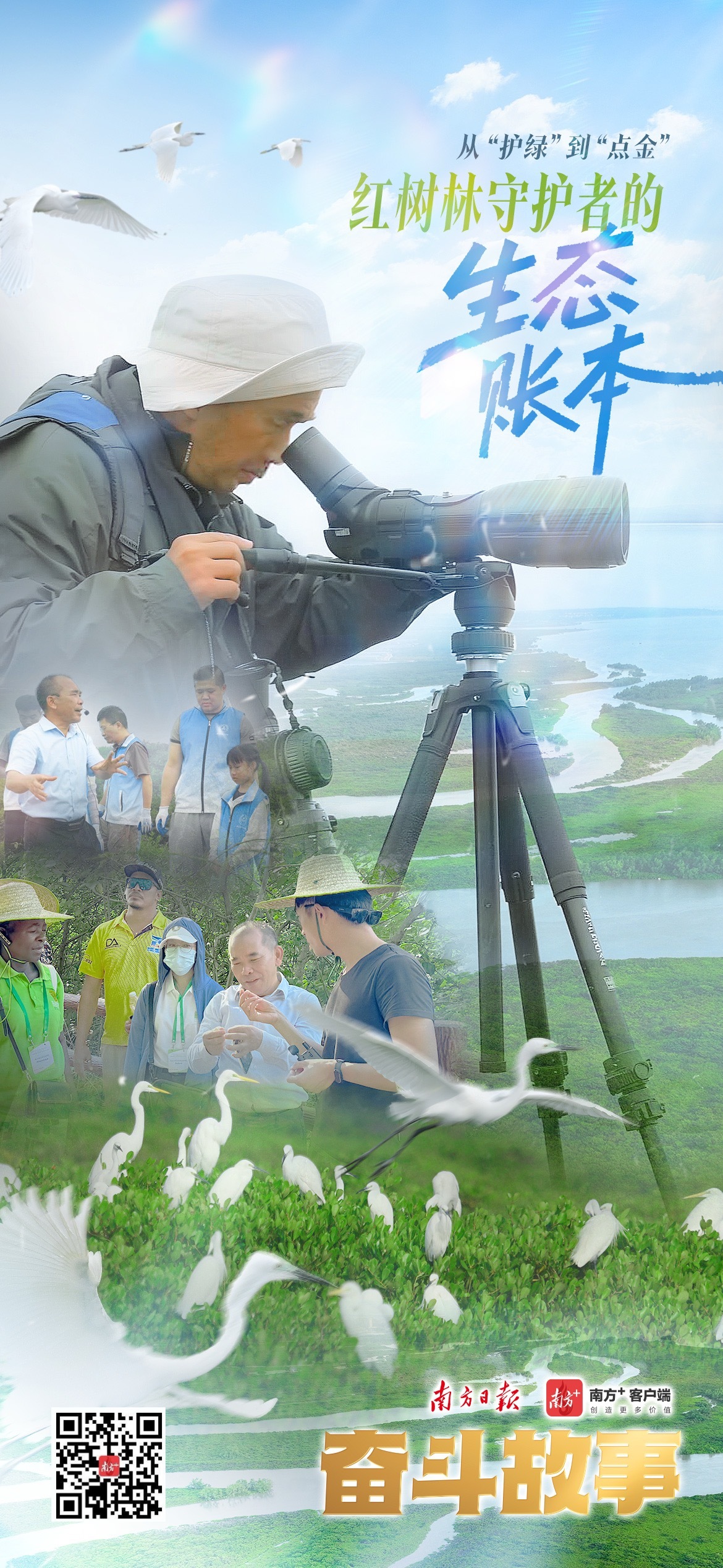 夕阳西下,红树林被染成金色。林广旋站在滩涂上,望着连绵的绿林和远处的归鸟,眼中映出一片明亮的憧憬。