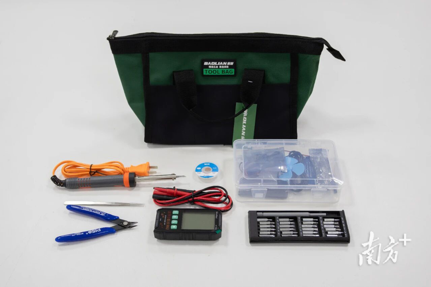 工具包里有电烙铁、万用表、斜口钳、镊子、螺丝刀以及一套完整的单片机开发平台。单片机开发平台包括开发板、超声波模块等多种模块,能够支撑学生完成智能小车、机械臂、环境监测系统等多种实践项目。