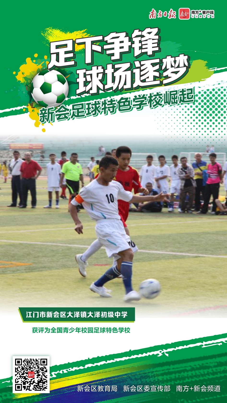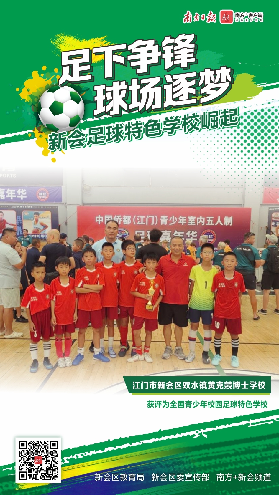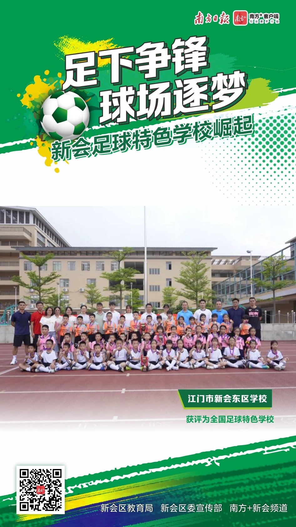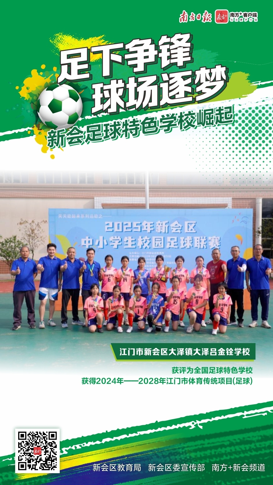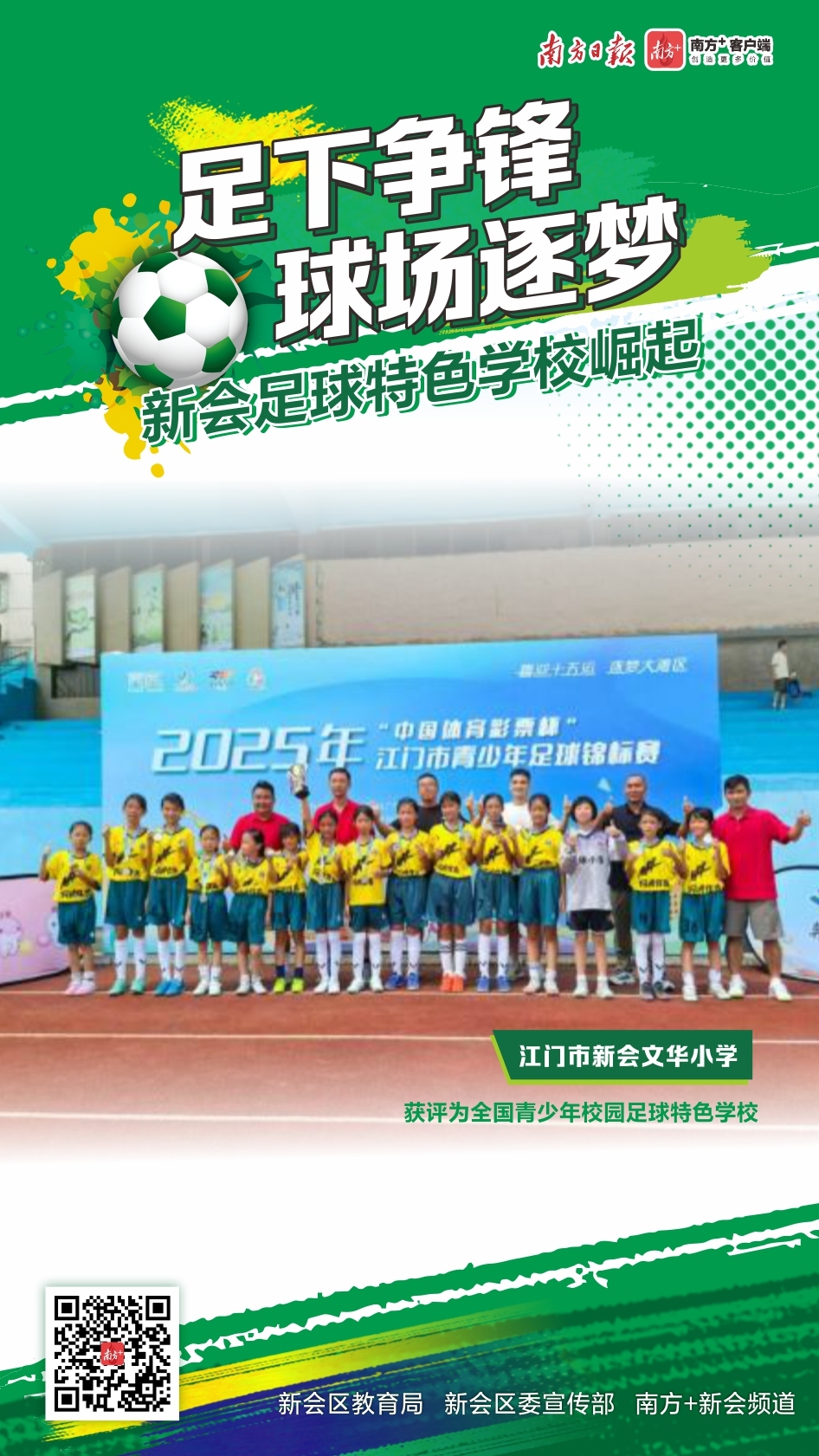 在江门新会,绿茵场上的角逐早已超越了单纯的胜负。当奔跑的脚步与成长的轨迹交织,新会的校园足球正完成从“足下争锋”到构建系统化“人才矩阵”的跨越,让每一个热爱足球的孩子,都能在这片沃土上找到属于自己的成长坐标,踢出人生的精彩弧线。12月9日是世界足球日,一起走近新会的足球特色学校,来看健儿们足下争锋、球场逐梦,踢出健康少年、踢出坚强团队、踢出活力校园。