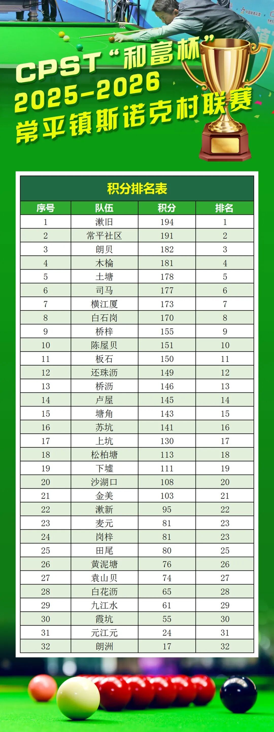 随着清脆的击球声在竞技场馆响起,CPST“和富杯”2025-2026常平斯诺克村联赛积分榜榜首争夺战也进入紧张阶段。本周即将上演新一轮对决,赛事精彩度将持续升级。