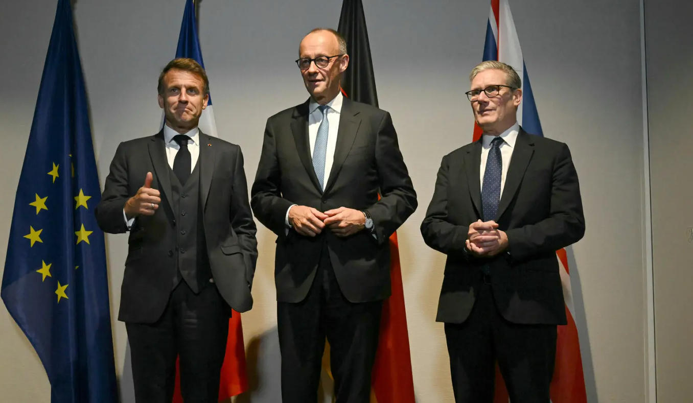 △法国总统马克龙(左)、英国首相斯塔默(右)和德国总理默茨(中)(资料图)