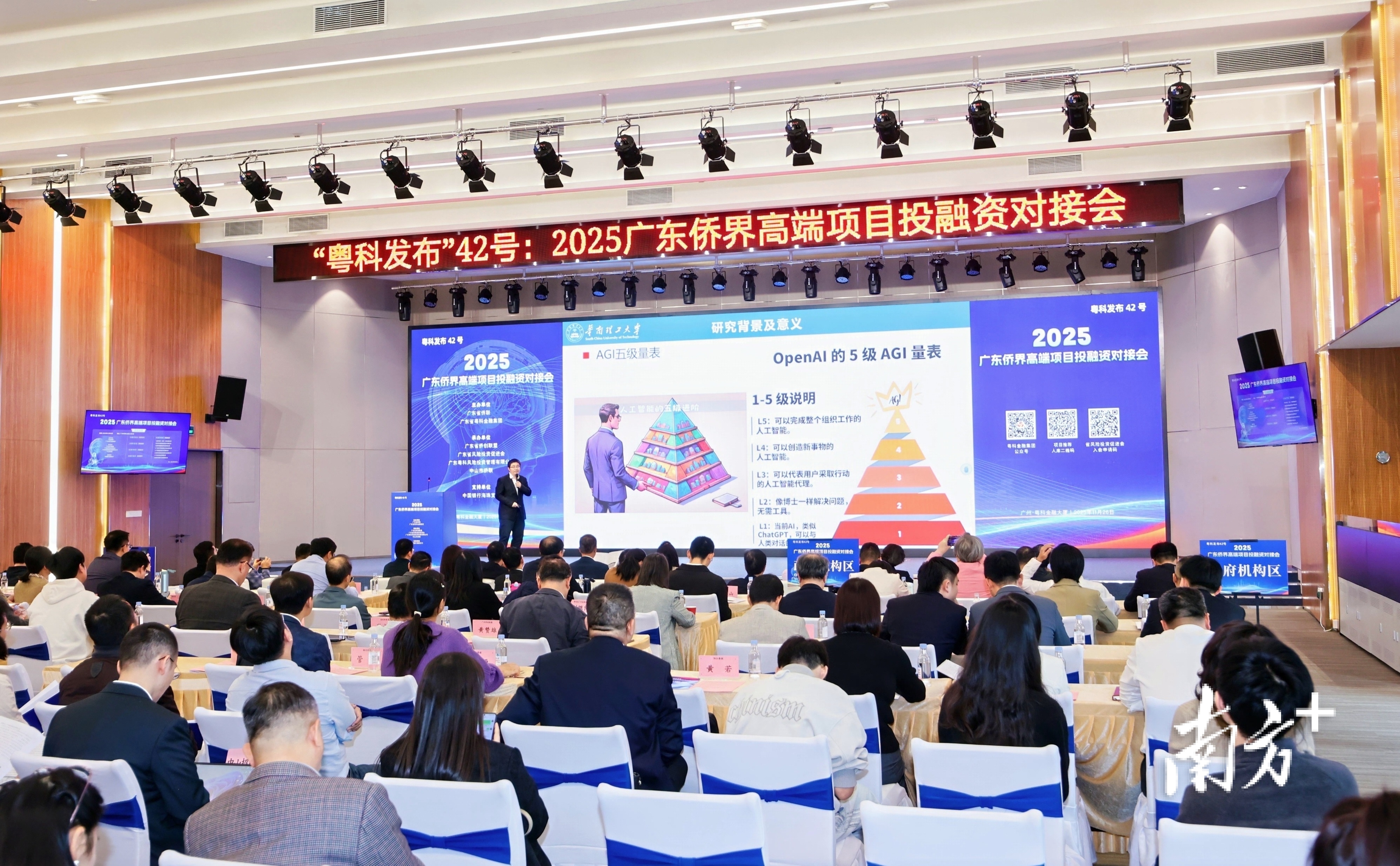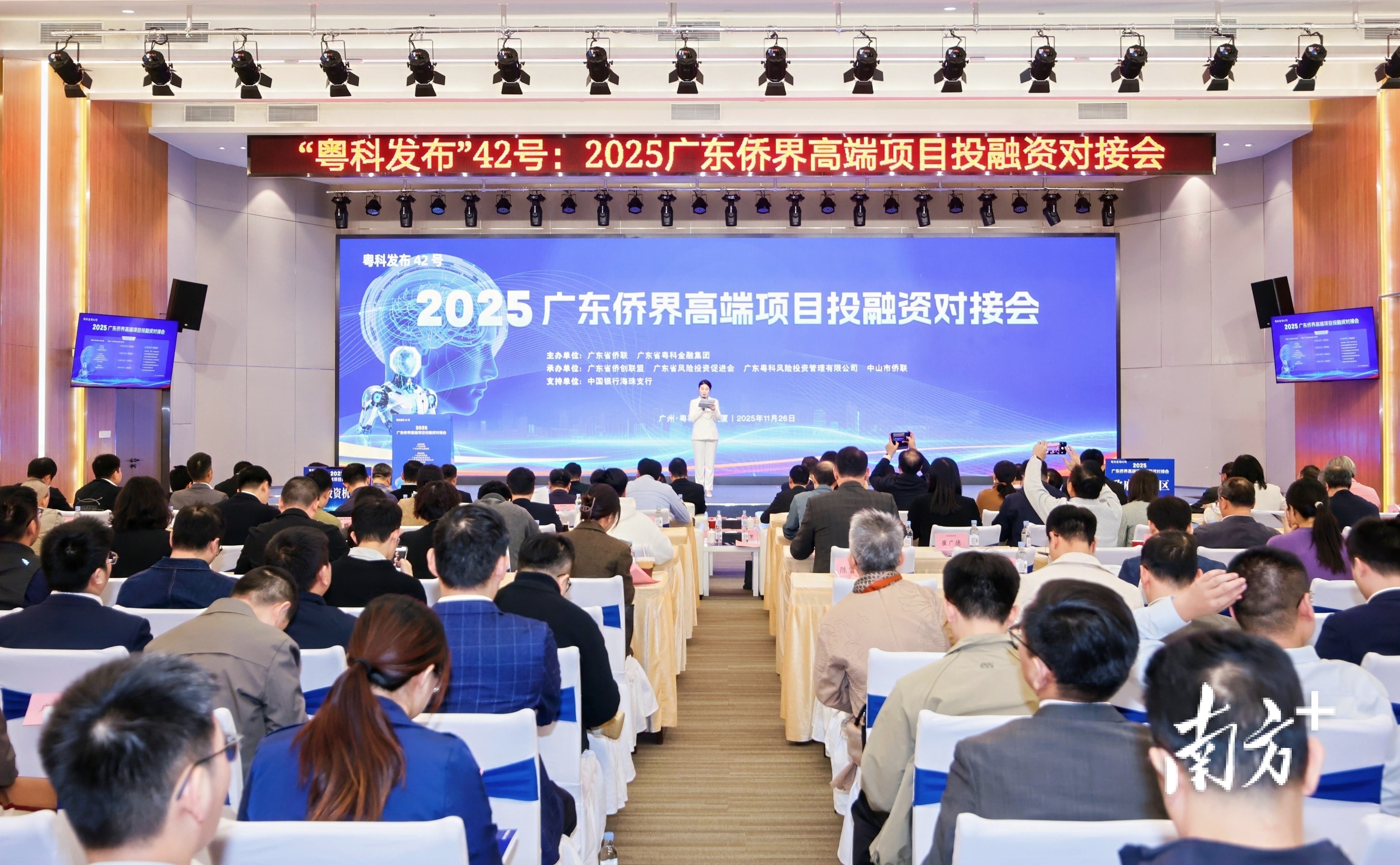 11月26日,以“人工智能与机器人”为主题的2025广东侨界高端项目投融资对接会(“粤科发布”42号)在广州举办,探索侨资侨智侨力与科技金融相互赋能的创新模式,搭建项目和资本的高效对接平台,推动粤港澳大湾区人工智能产业高质量发展。来自有关政府部门和海内外侨界企业、投资机构、科研院所的200余人参会。