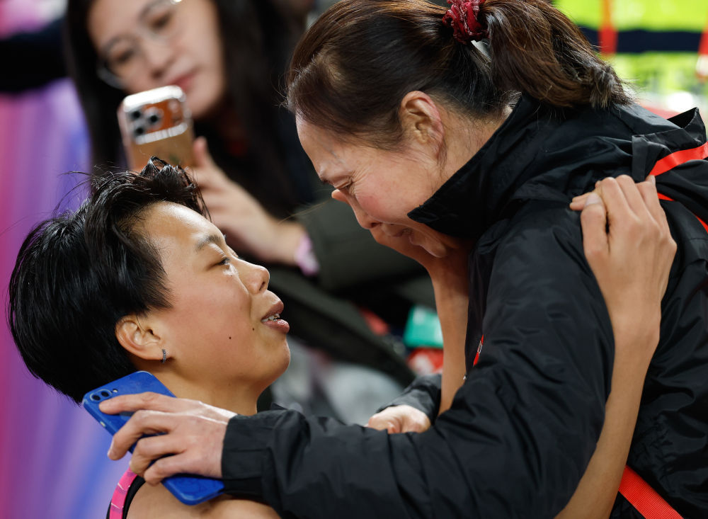 11月19日,广东队选手刘景扬(左)在比赛后和母亲交流。她夺得冠军。新华社记者 黄伟 摄