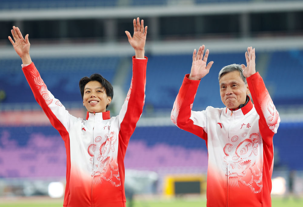 11月19日,广东队选手刘景扬(左)与教练在颁奖仪式上。新华社记者 黄伟 摄