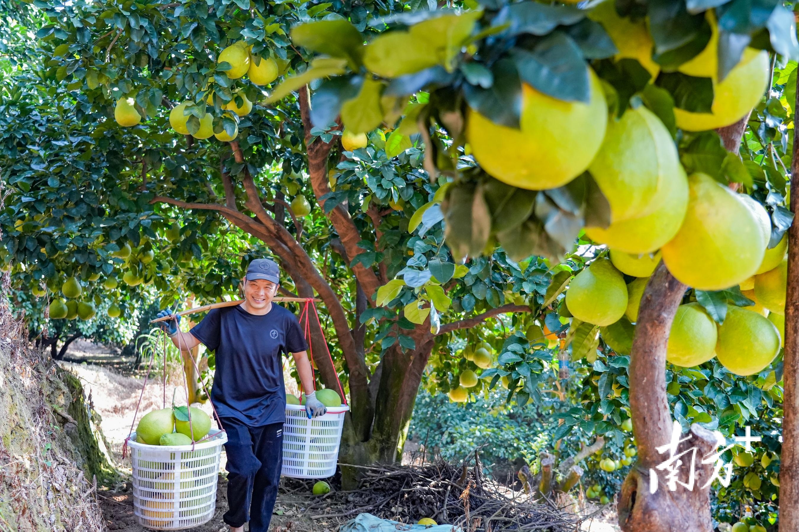 梅州梅县区雁洋镇南福金柚种植基地里,果形饱满的金柚装满筐。 南方+记者 何森垚 摄