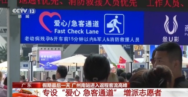 除了加开验证通道和安检通道之外,广州南站还专设了“爱心 急客通道”,为老幼病残孕等特殊旅客及临近发车旅客提供优先服务;并在服务台、爱心候车区、母婴室等区域增派了70名青年志愿者,为旅客及时排忧解难。