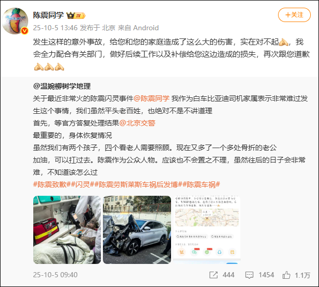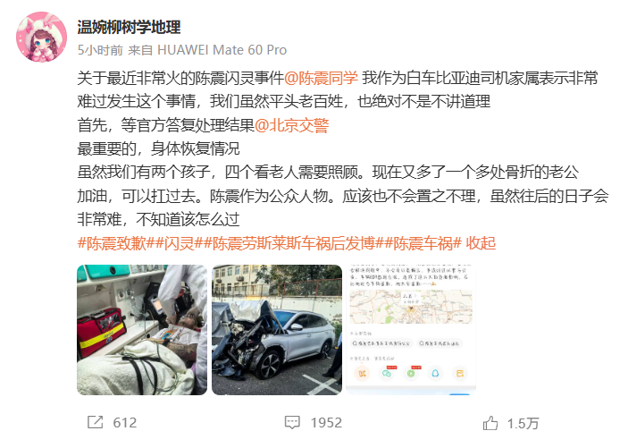 10月5日上午,事故中疑似另一辆受损的比亚迪司机家属发文称,丈夫多处骨折,往后的日子不知道该怎么过。