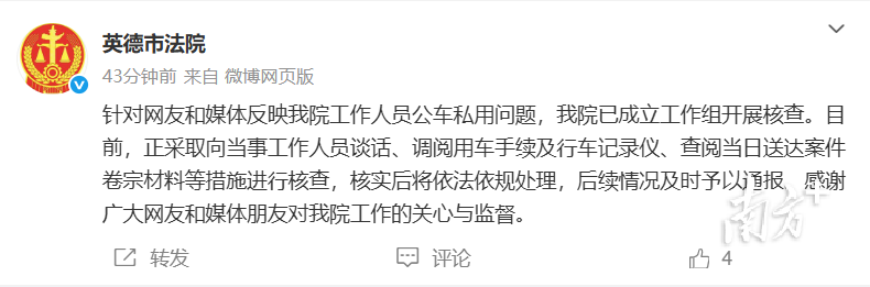 9月25日晚,涉事的英德市法院在官方微博回应称,针对网友和媒体反映的工作人员公车私用问题,已成立工作组开展核查。目前,正采取向当事工作人员谈话、调阅用车手续及行车记录仪、查阅当日送达案件卷宗材料等措施进行核查,核实后将依法依规处理,后续情况及时予以通报。感谢广大网友和媒体朋友对英德市法院工作的关心与监督。