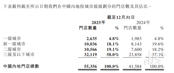其中,核心品牌蜜雪冰城国内门店约4.4万家,持续渗透下沉市场,三线及以下城市占比最大;鲜啤福鹿家于2025年12月纳入集团版图,并购完成时已拥有1354家加盟门店、20家直营门店。
