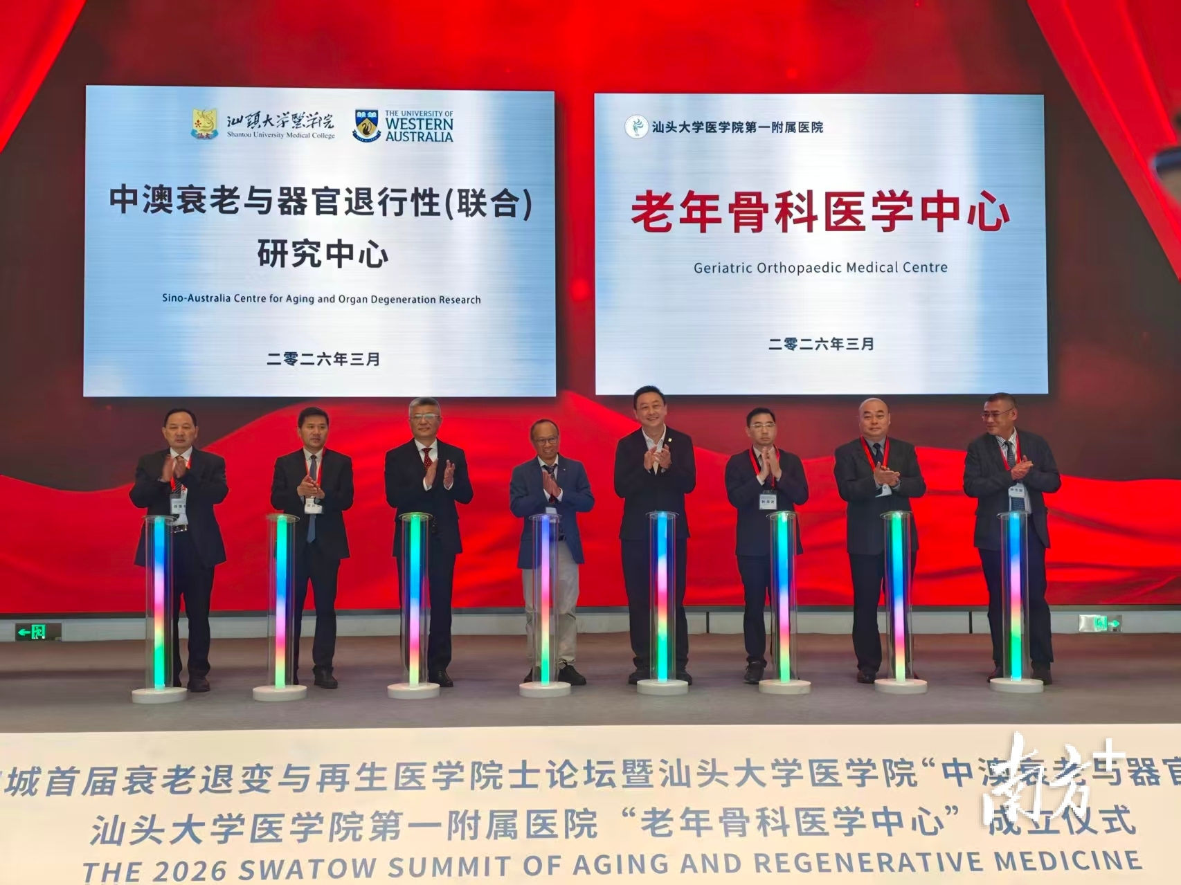 3月28日,汕头大学医学院鮀城首届“衰老退变与再生医学院士论坛”在汕头举行,海内外专家学者齐聚鮀城,共探老年健康前沿课题。会上,“中澳衰老与器官退行性(联合)研究中心”与汕头大学医学院第一附属医院“老年骨科医学中心”正式揭牌,标志着汕头大学医学院在应对人口老龄化、推动衰老与再生医学研究及临床转化上迈向新阶段。