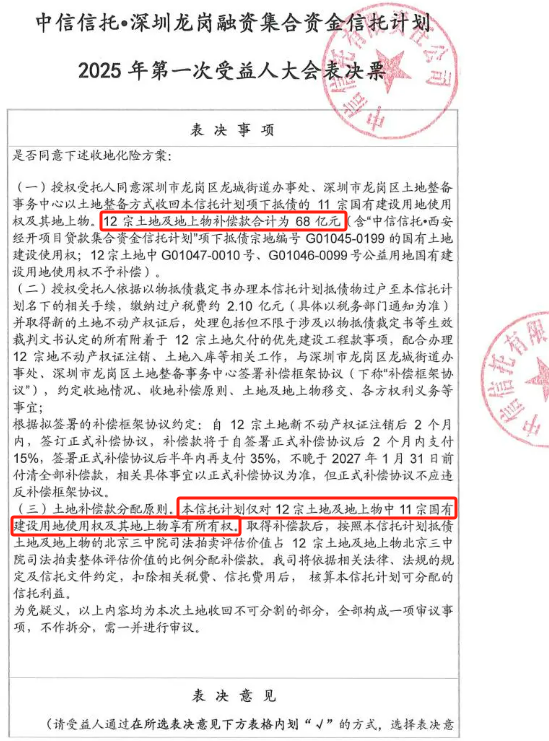 该方案直接关联“深圳龙岗融资集合资金信托计划”的全体投资人。目前,项目12宗土地中有11宗权属归属于该信托计划。若方案通过,68亿元资金将优先用于清偿项目拖欠的各类税费、信托计划管理费以及工程款等刚性支出,剩余部分按比例分配给信托计划投资人。