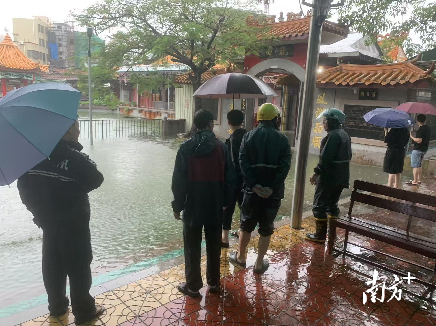 9点08分,汕头中心城区进入橙色预警;9点48分,濠江区达濠街道进入红色预警状态,暴雨积水最深达到40cm。达濠街道火速启动应急处置,第一时间组织各社区对低洼地、老厝区进行排查,及时转移需要转移群众。“恰逢天文退潮期,江河水位较低,所以各个涵闸往江里排水比较快,不然内涝情况会更加严重。”上午10点50分,达濠街道有关负责人表示,经排查,辖内个别低洼地存在少量积水,街道正协同有关部门对个别低洼点积水进行强排工作。