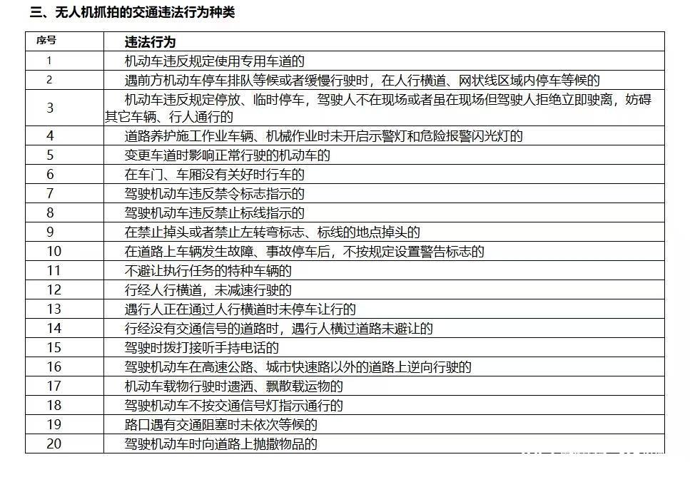 无人机抓拍的交通违法行为种类根据公告,此举是为了进一步加强道路交通安全管理,预防和减少道路交通事故发生,确保道路安全畅通,使用无人机抓拍违法交通行为达20种。启用公示期为2025年11月1日至11 月10日(公示期10天),交警部门将于2025年11月11日起启用移动交通技术监控设备(无人机监控)进行车辆违法行为抓拍取证录入处罚。