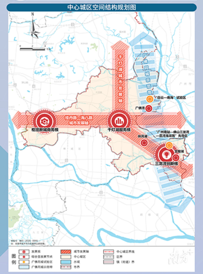 “三核”包括千灯湖服务核、枢纽新城商务核、三龙湾创新核,“两轴”即千灯湖城市发展轴、桂丹路—海八路城市服务轴,“一带”是指在广佛交界地区形成广佛同城示范带,“多片”即形成广佛湾、映月湖、文翰湖3个综合发展片区和“广州南站—佛山三龙湾—荔湾海龙围”先导区、“白云—南海”试验区等2个广佛高质量发展融合试验区。