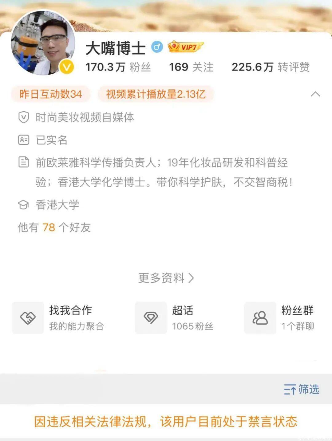 公开资料显示,“大嘴博士”原名郝宇,是时尚美妆视频自媒体博主,在社交媒体平台拥有超170万粉丝。据“大嘴博士”账号简介,其为香港大学化学博士,曾任欧莱雅科学传播负责人,拥有19年化妆品研发及科普经验。