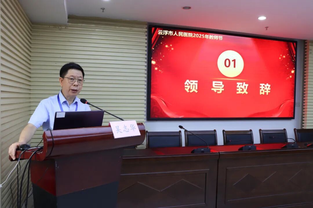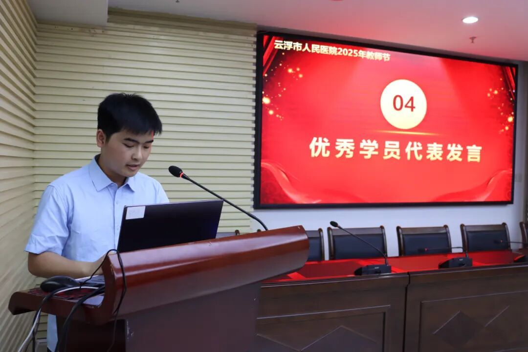 吴志华院长向辛勤耕耘在医学教育一线的带教老师,以及在医疗实践中热心传授经验的同事们致以崇高敬意和节日祝福,并对选择并信任云浮市人民医院的规培医师和助理全科培训医师表示热烈欢迎。他强调,医学的未来在于人才,人才的培养在于教育,希望获奖者珍惜荣誉、再接再厉,继续在医学教育道路上发光发热,为培养更多优秀医学人才贡献力量;同时号召全院同仁以先进者为榜样,不断提升教学能力和水平,共同推动医院教学工作再上新台阶。