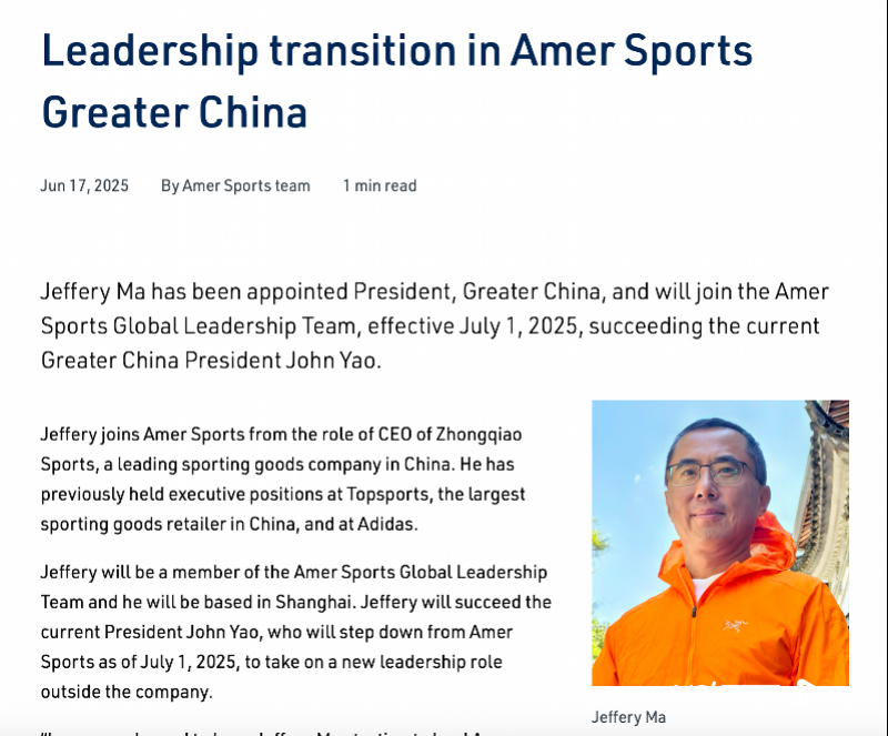 今年7月,始祖鸟母公司亚玛芬体育刚刚迎来中国区管理层的大换血。据亚玛芬体育官网,Jeffery Ma(马磊)被任命为大中华区总裁,并于2025年7月1日起加入Amer Sports(亚玛芬体育)全球领导团队,接替现任大中华区总裁姚剑。