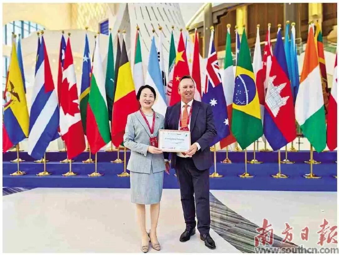 在青岛举办的2025海洋合作发展论坛现场,国际组织宜可城—地方可持续发展协会(ICLEI,以下简称“宜可城”)全球秘书长吉诺·范比金将“自然城市”奖牌颁给南沙区代表。