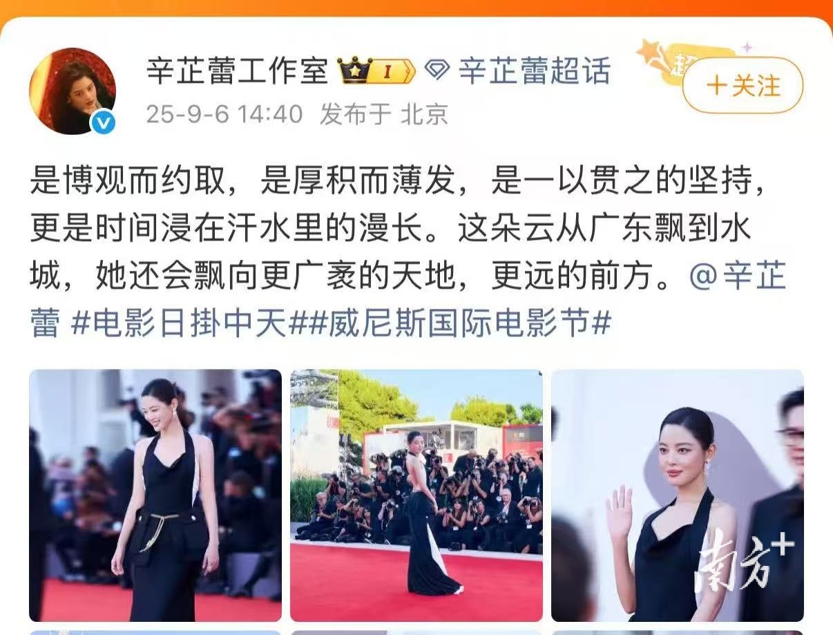 当地时间9月6日晚,中国内地女演员辛芷蕾凭借粤产电影《日掛中天》中“美云”一角夺得本届威尼斯电影节主竞赛单元最佳女演员奖项,成为首位获得世界三大国际电影节最佳女演员奖项的“80后”华人女演员。同时,《日掛中天》也是广东首部在国际三大电影节主竞赛单元获奖的影片。