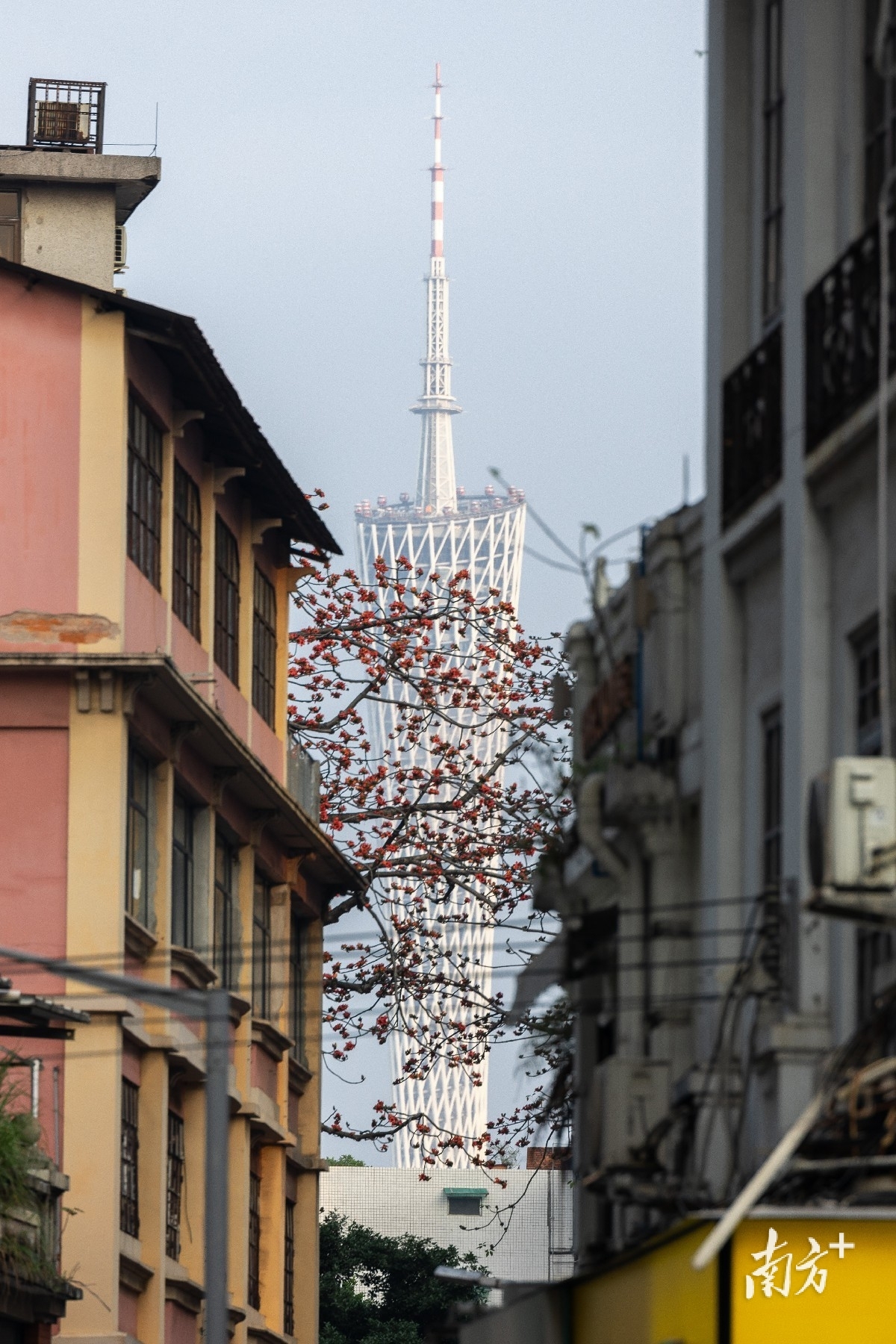在东山口盛开的木棉花与远处的广州塔互相辉映。